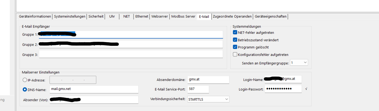 Ich versuche jetzt schon länger über eine easyE4 Alarmierungen per E-Mail zu versunden. Habe es schon mit verschiedenen Mail-Anbietern (GMAIl, GMX, MAILJET, MAILGUN) getestet, bekomme aber immer folgenden Fehler, egal welche Verschlüsselung, Port, etc. ausgewählt ist: